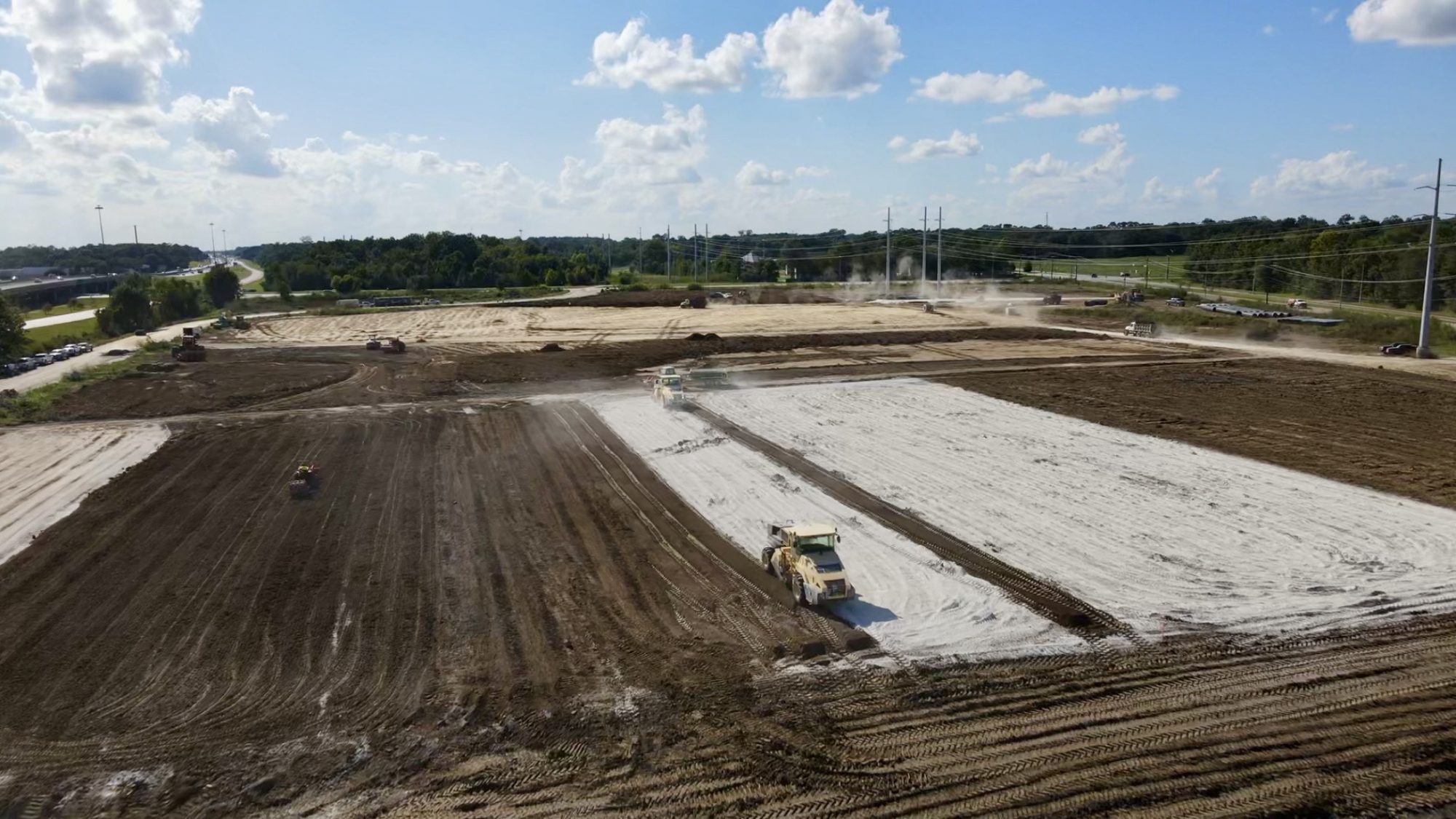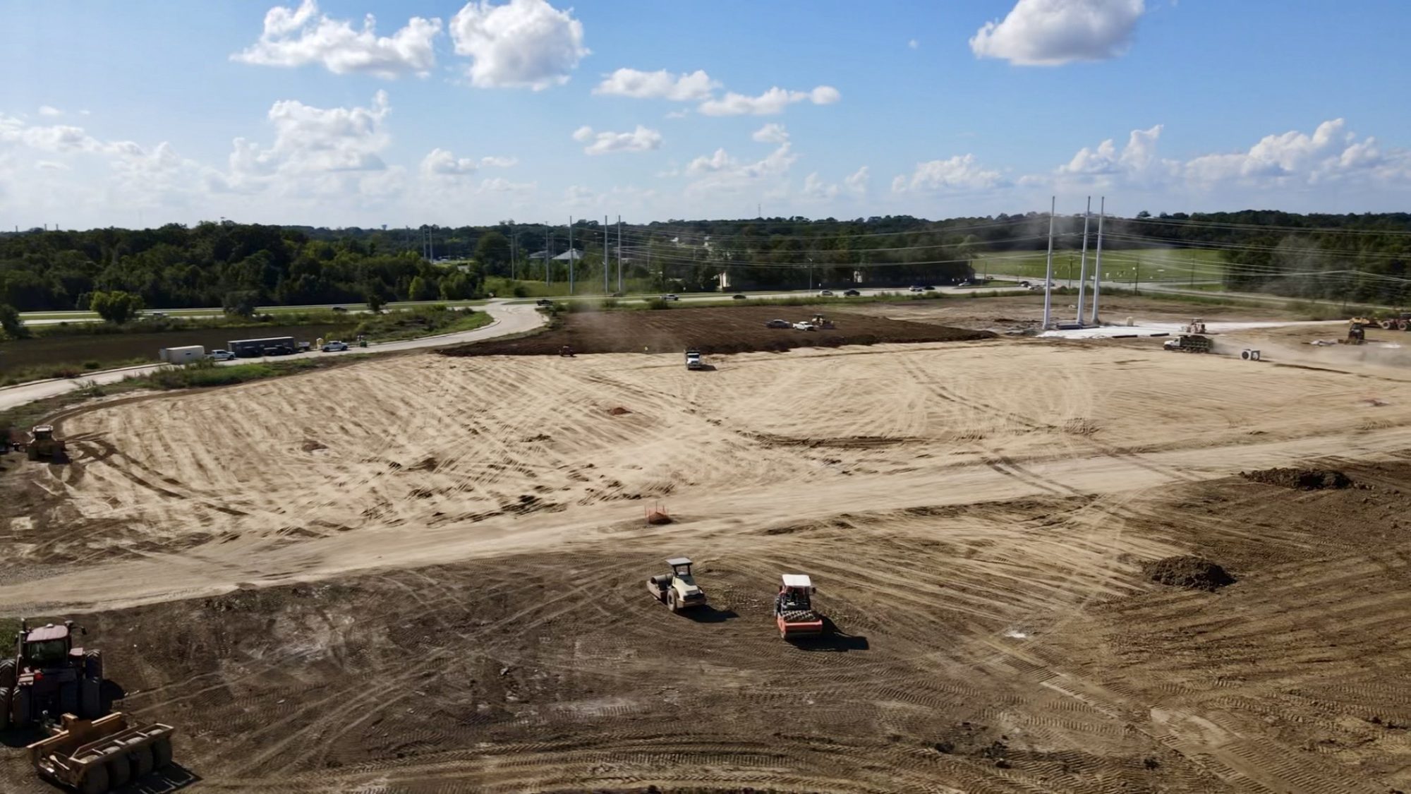 Current work includes continued grading, limestone placement, and infill along low areas of the property—standard preparation steps ahead of foundation work. Equipment and materials remain active across the 42-acre site, and several portions are taking shape along with drainage improvements.