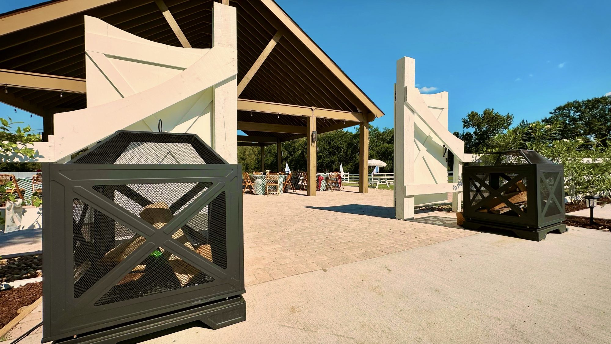 The setting combines natural rustic charm with subtle touches of elegance. The pond toward the back of the property features a fountain that creates a relaxing backdrop, and warm ambient lighting highlights the trees, pathways, and wooded edges throughout. Natural wood fire pits are places at the entrance, providing a warm vibe for guests coming to the events.