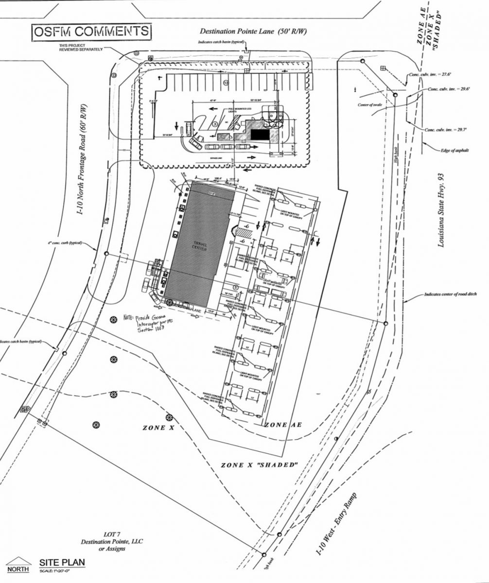 Plans for the project, developed under Cajun Play, LLC, show a large-format convenience store with about 20 fuel pumps, similar in scale to travel center brands like RaceTrac or QuikTrip—though not confirmed. The c-store is estimated to be around 6,000 to 8,000 square feet.