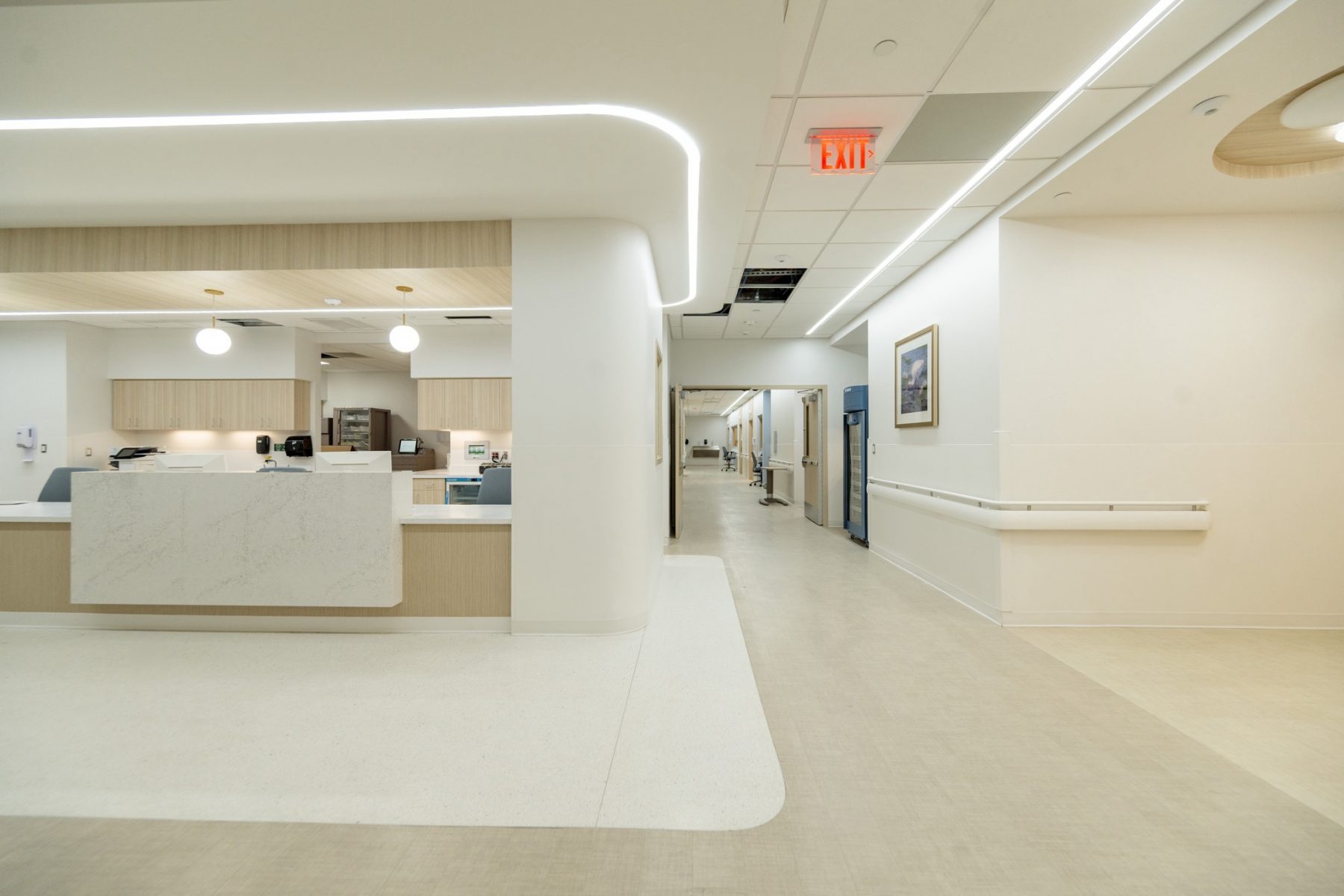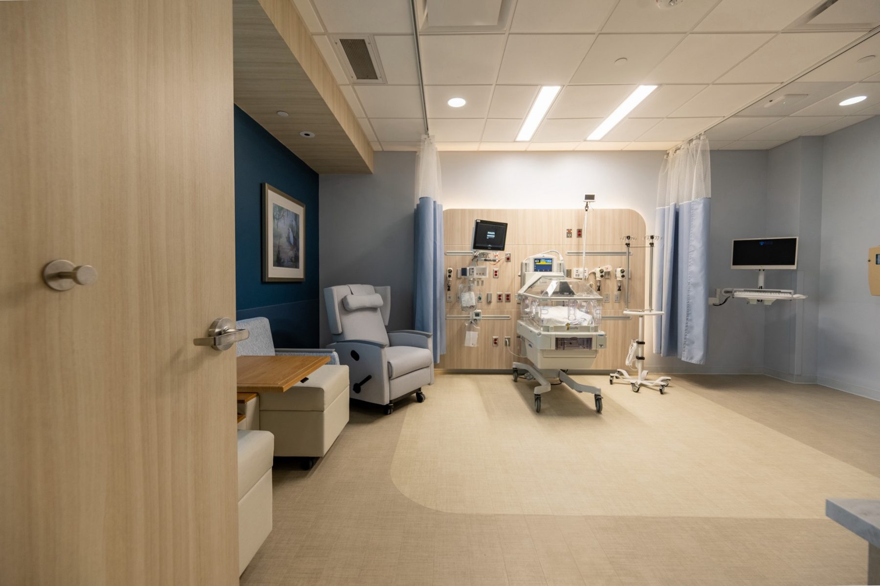 In addition to patient rooms, the unit includes dedicated family support spaces, such as a donor-funded family lounge that serves as a respite area for parents during what is often an intense and emotional experience. The design also incorporates quieter, more controlled environments compared to traditional NICU layouts, reducing noise and stimulation for newborns.